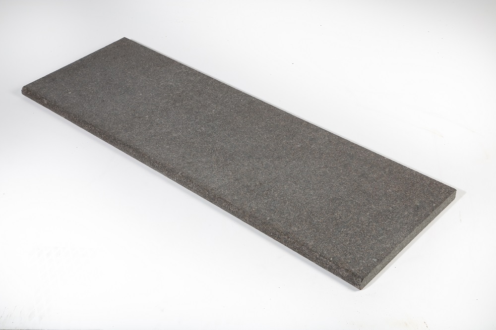 Zwembadrand met rechte boord in hoogwaardig, gevlamd en geborsteld graniet type New Twilight van Beltrami. Afmetingen: 60/30/5-3cm